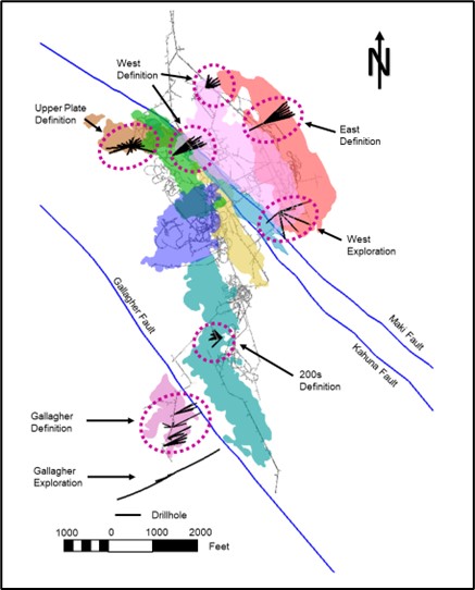 At Greens Creek, underground definition drilling will focus on the 200 South, Upper Plate, 9A, West, Northwest West, Southwest, and East ore zones while underground exploration will focus on the 200 South, Gallagher, Gallagher Fault Block zones, the northern end of the East Ore Zone and up dip from the northern end of the West Ore Zone. Surface exploration drilling will focus on the Upper Plate Zone, the western part of the Gallagher Fault zone, the eastern part of the East Zone and the Lil’Sore prospect, which is the most anomalous and untested target away from the mine.